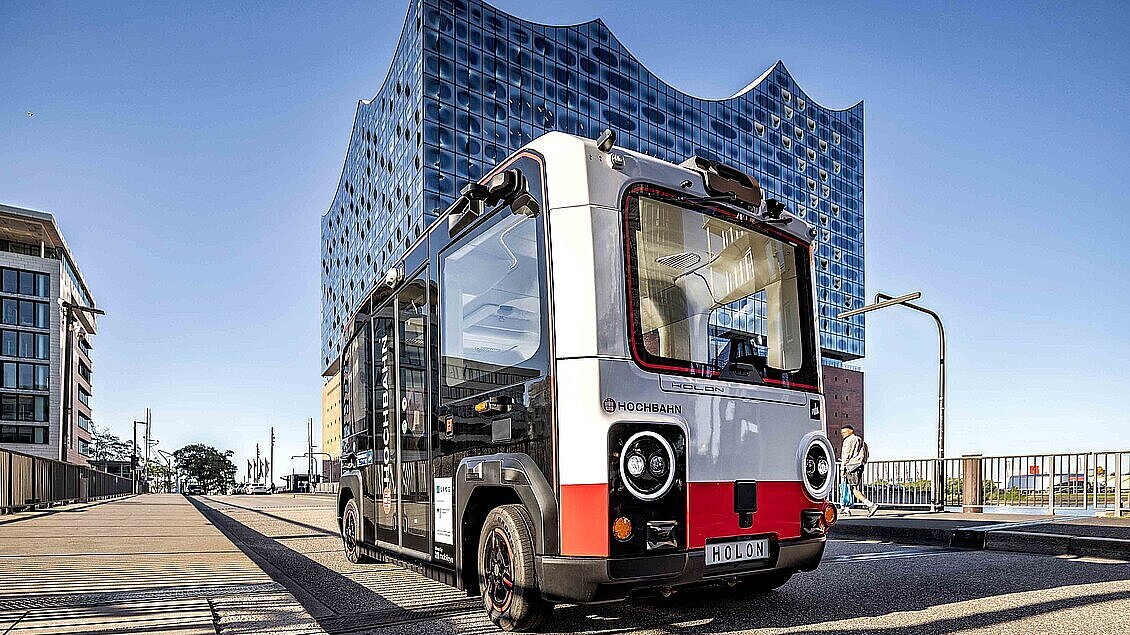 Ein Kleinbus von Holon vor der Hamburger Elbphilharmonie. Schon bald sollen die autonomen Fahrzeuge auch in der Hansestadt unterwegs sein. Quelle: Hochbahn