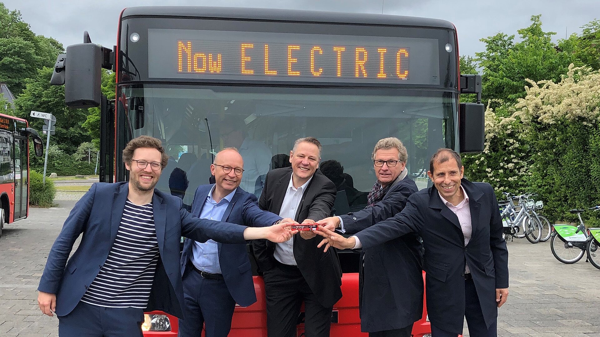Präsentierten den umgerüsteten Bus (v. l.): Jan Philipp Albrecht, Minister für Energiewende, Landwirtschaft, Umwelt, Natur und Digitalisierung des Landes Schleswig-Holstein, Frank Klingenhöfer, Vorstand DB Regio Bus, Marten Jensen, Geschäftsführer GreenTEC Campus, Bernd Buchholz, Minister für Wirtschaft, Verkehr, Arbeit, Technologie und Tourismus des Landes Schleswig-Holstein, und Andreas Pfeffer, Geschäftsführer I SEE Electric Busses GmbH; Foto: DB AG
