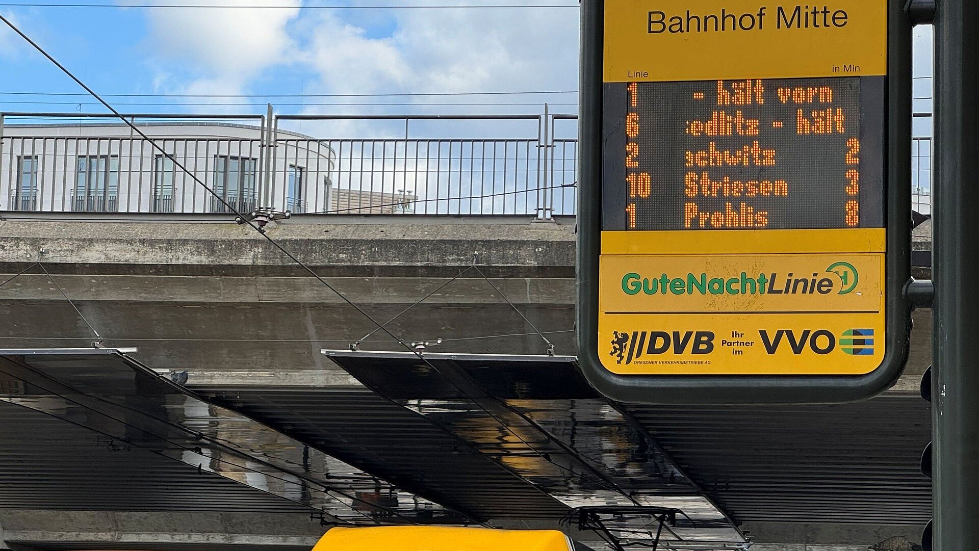 Problem sei bislang, erläuterte DVB-Sprecher Falk Lösch gegenüber der NaNa, dass auf dem Doppelhaltestellenknoten für die Fahrgäste nicht ersichtlich sei, welche Linie zuerst einfahre, was über die konkrete Halteposition auf der Station entscheide. In der Folge komme es zu Hektik und gegenseitigen Behinderungen, da Fahrgäste nach vorne oder hinten laufen müssten, um ihre Bahn zu bekommen. „Nun zeigen wir an den Abfahrtstafeln zusätzlich zu den bestehenden Fahrgastinformationen an, wo an der Station – vorne oder hinten – der Wagen der jeweiligen Linie hält“, erklärte Lösch. Die Anzeige sei frühestens 50 Sekunden vor Einfahrt möglich und reagiere auch danach noch dynamisch.