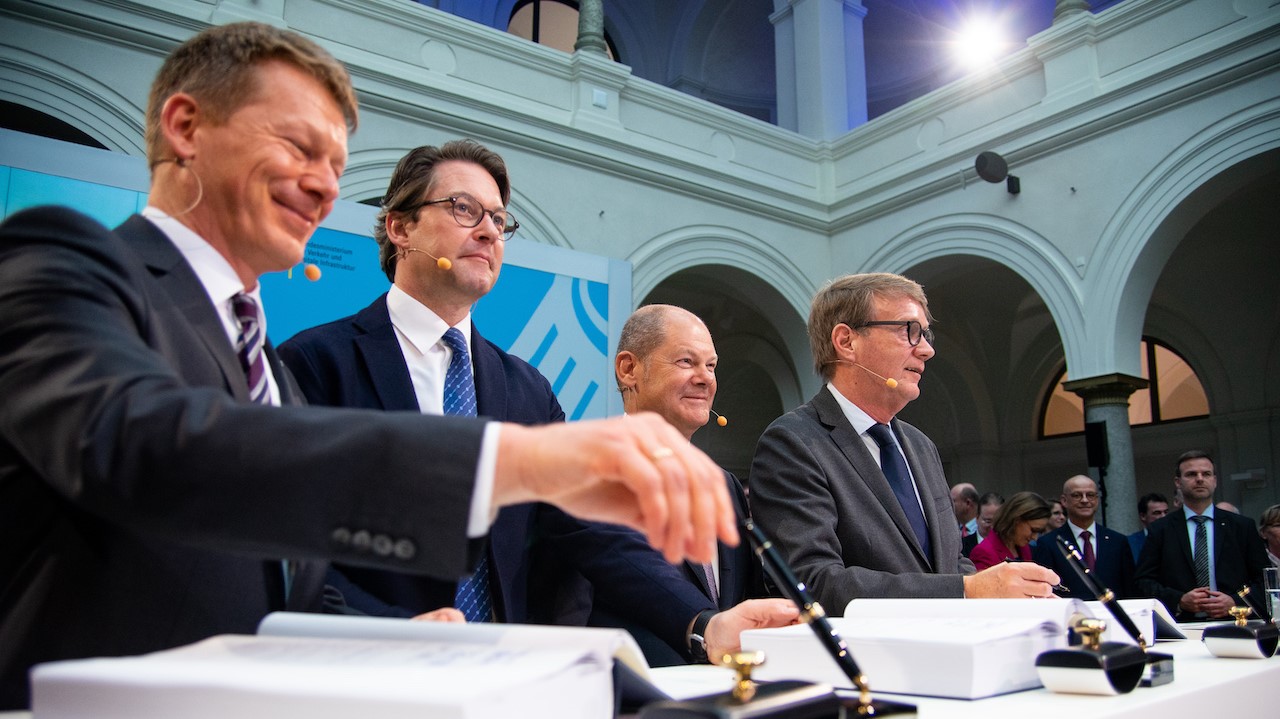 Schritten zur Unterschrift (v. l.): DB-Vorstandsvorsitzender Richard Lutz, Bundesverkehrsminister Andreas Scheuer, Bundesfinanzminister