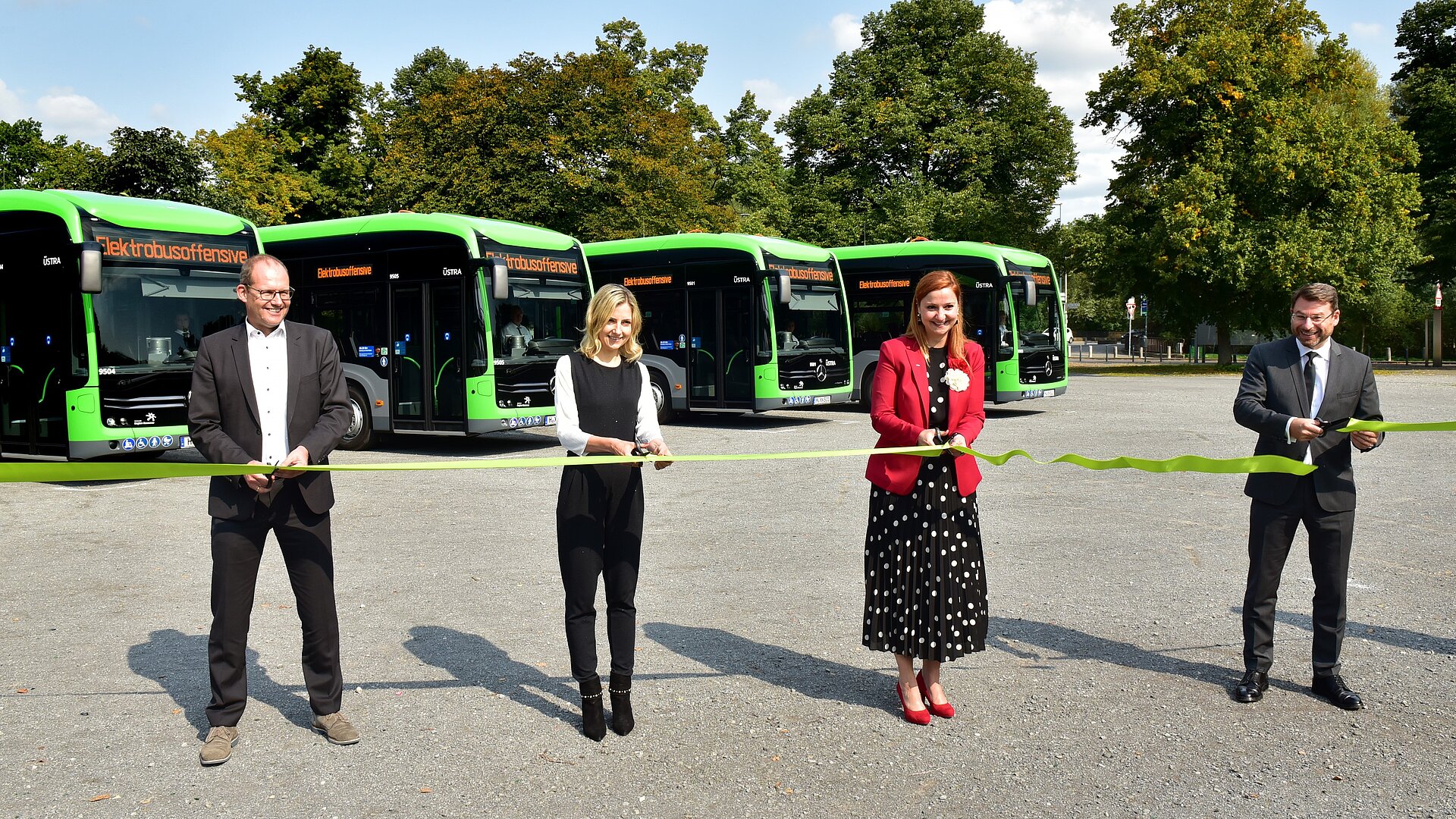 Gaben die Fahrt der zunächst vier neuen Elektrobusse frei (v. l.): Ulf-Birger Franz, Aufsichtsratsvorsitzender, Elke van Zadel, Üstra-