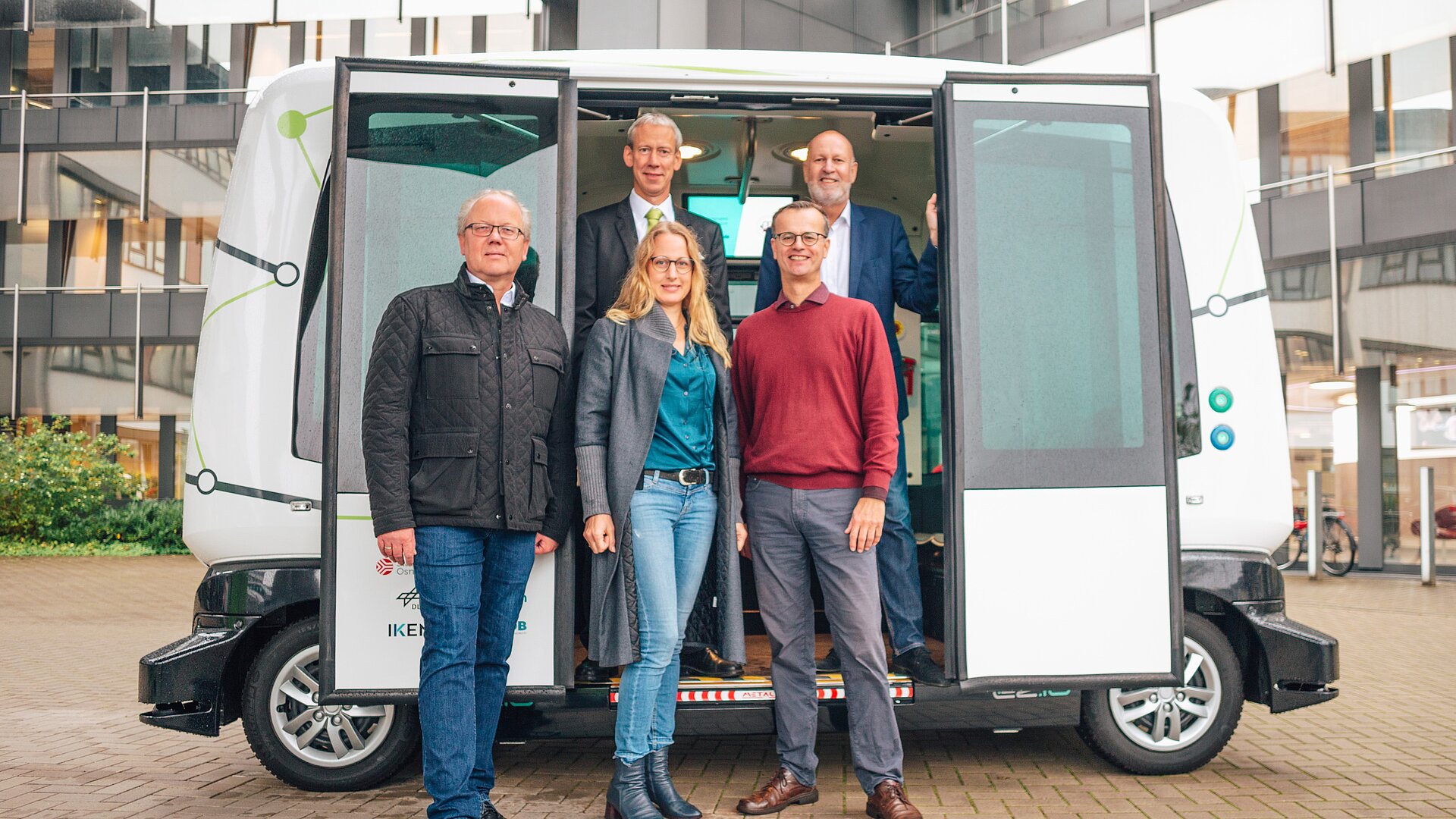 Gemeinsame Testfahrt mit dem autonomen Minibus „Hubi“: (Vorne v. l.) Werner Linnenbrink, Leiter Mobilitätsangebot Stadtwerke, Anna Kebschull, designierte Landrätin, Volker Bajus, Vorsitzender Grüne-Ratsfraktion, sowie (hinten v. l.) Michael Kopatz, Grüne-Ratsfraktion, und Stephan Rolfes, Stadtwerke-Mobilitätsvorstand; Foto: Stadtwerke Osnabrück/Jessica Fischer