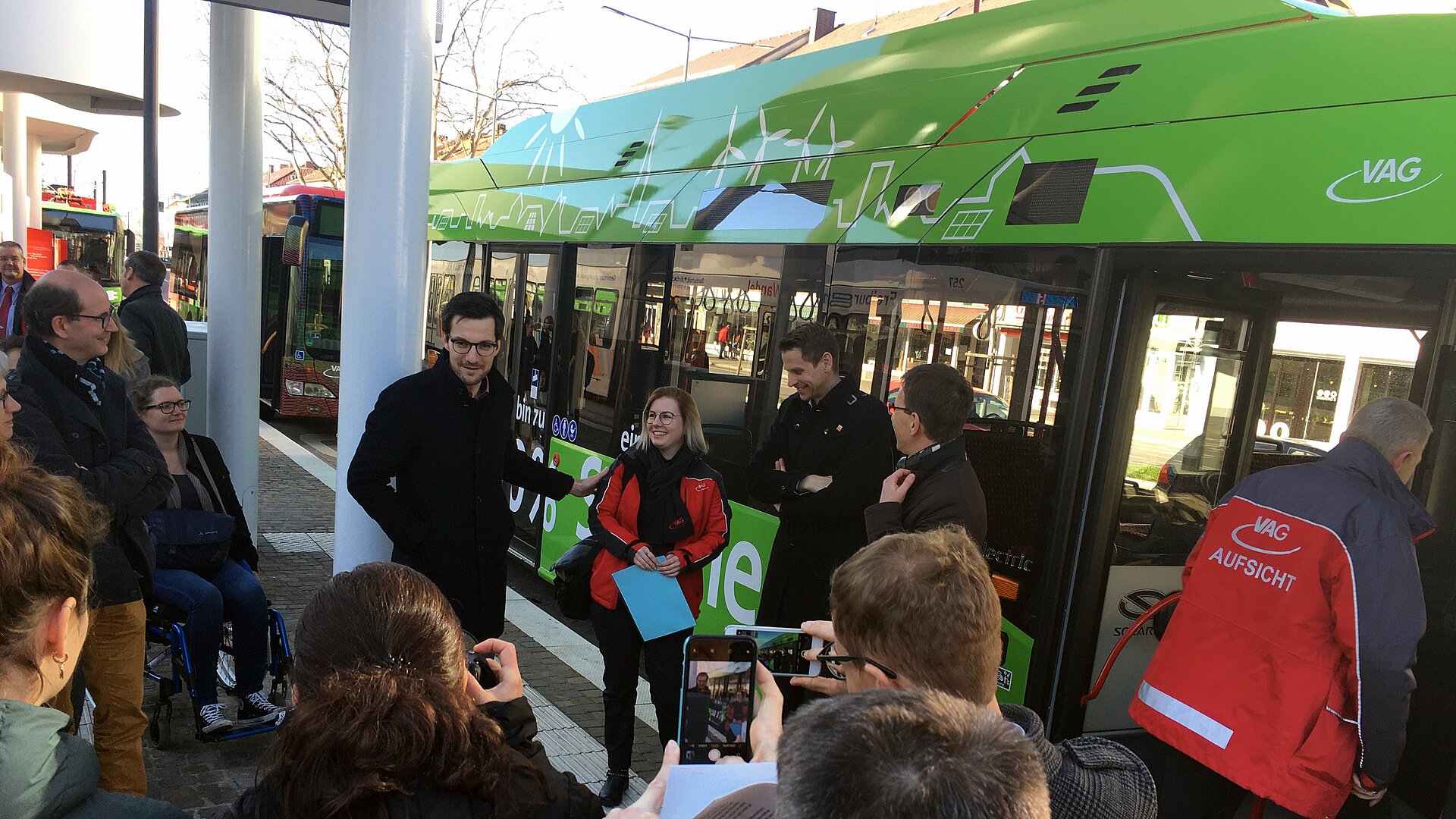 Oberbürgermeister Martin Horn (l.) und die VAG-Vorstände Stephan Bartosch und Oliver Benz begleiten die VAG-Fahrerin Laura Kiefer zur ersten E-Bus-Linienfahrt; Foto: VAG Freiburg