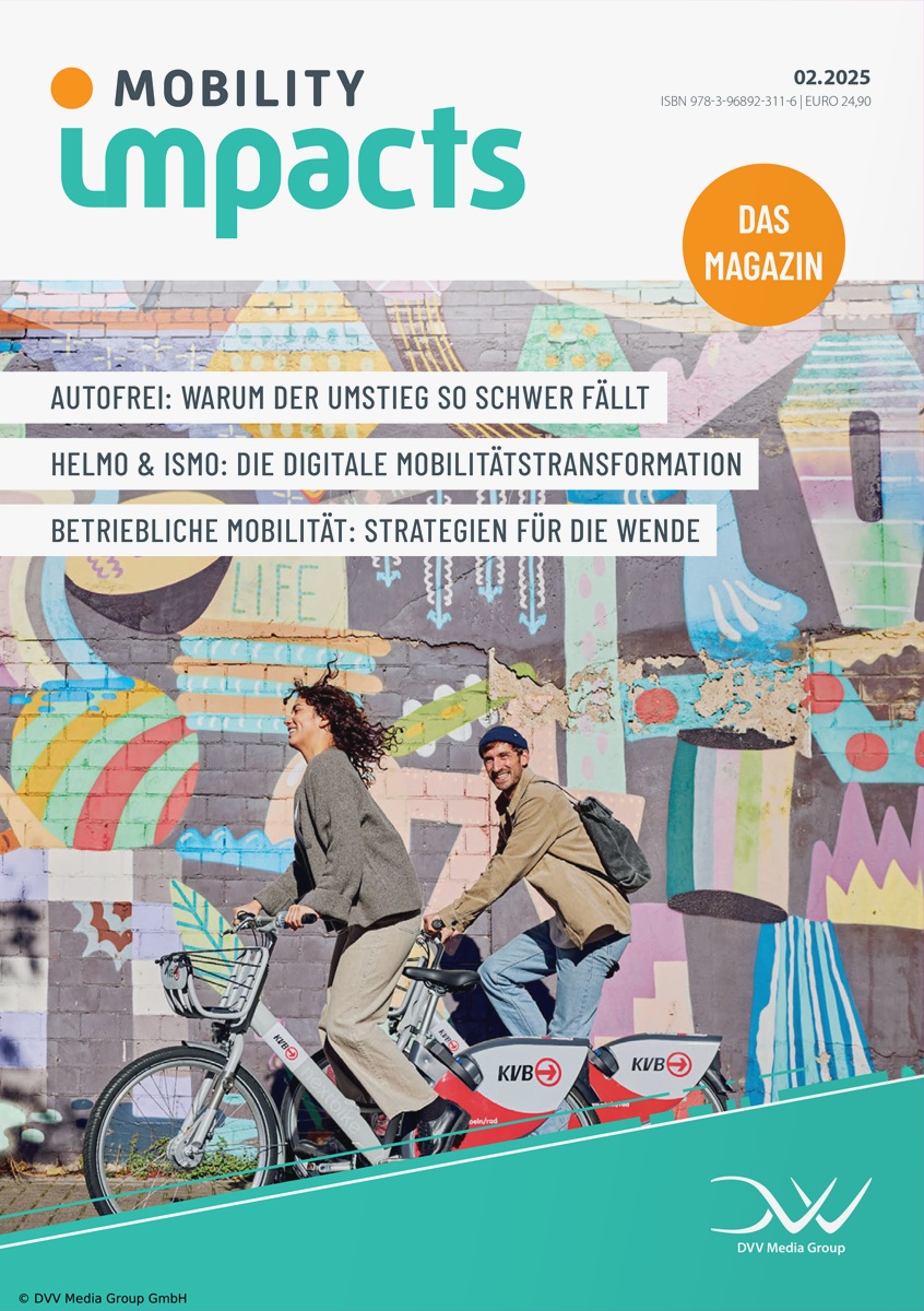 Mobility Impacts ist die junge Medienmarke der DVV Media Group für neue Mobilitätskonzepte. Ob "Mobility as a service" in Form von On-Demand- und Ridepooling-Diensten, Car- und Bikesharing, ob autonomes Fahren, Mobilitätsplattformen oder generell den Zusammenhang von Stadt- und Verkehrsplanung: Die Website von Mobility Impacts bietet Nachrichten zum Überblick über politische, regulatorische und finanzielle Rahmenbedingungen, über Konzepte und technologische Entwicklungen sowie Umsetzungsbeispiele und Erfahrungsberichte. Das zweimal jährlich erscheinende Magazin greift diese Themen in vertiefenden Fachbeiträgen auf.