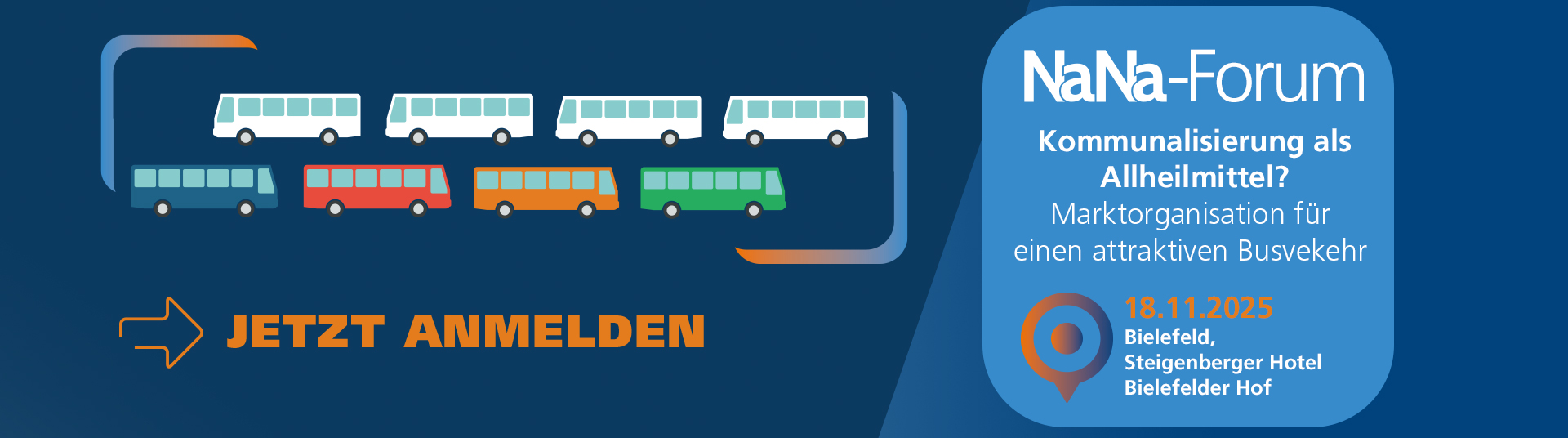 Diese Fragen stehen im Mittelpunkt des NaNa-Forums am 18.11.2025 in Bielefeld. Dabei kommen Vertreter von Aufgabenträgern, Verkehrsunternehmen und Verbänden zu Wort, die ihre Erfahrungen und Erwartungen an Ausschreibungen und Kommunalisierungen teilen. So werden zentrale Faktoren der Marktorganisation für einen attraktiven Regionalbusverkehr unter den aktuellen Rahmenbedingungen diskutiert.
